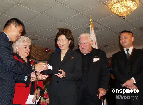 當(dāng)?shù)貢r間9月29日,美國勞工部長趙小蘭到洛杉磯向亞裔民眾說明美國經(jīng)濟低迷“解套”辦法,為民眾打氣。加州眾議員陳文、核桃市議員林恩成、鉆石吧市議員張文彬等華人民選官員陪同參加。圖為華人代表向美國勞工部長趙小蘭贈送紀念品。 中新社發(fā) 盧威 攝