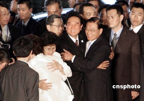 十一月三日,海峽兩岸關(guān)系協(xié)會會長陳云林乘專機(jī)抵達(dá)臺北,出席“第二次陳江會談”。海基會董事長江丙坤在圓山飯店舉行歡迎儀式。圖為海協(xié)會會長陳云林進(jìn)入臺北圓山飯店與江丙坤熱情擁抱。中新社發(fā) 洪少葵 攝
