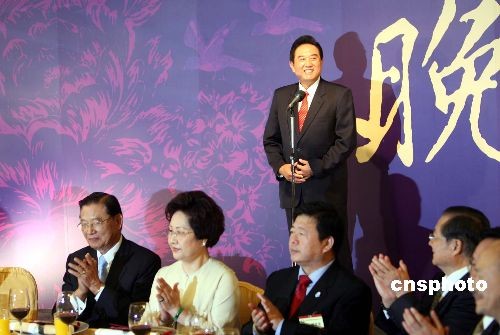 十一月三日晚,臺(tái)灣;鶗(huì)董事長江丙坤在世界第一高樓臺(tái)北101設(shè)接風(fēng)宴,為首次來臺(tái)的大陸海協(xié)會(huì)會(huì)長陳云林接風(fēng)。圖為陳云林在海基會(huì)歡迎宴會(huì)上致辭感謝。中新社發(fā) 洪少葵 攝