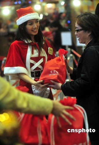 十二月一日,香港一商場舉行“一元圣誕禮品包”優(yōu)惠活動(dòng),吸引市民搶購。餐飲業(yè)為了對抗金融海嘯,逾百間食肆和商鋪十二月起會輪流推出一元優(yōu)惠,希望在逆市中刺激消費(fèi)。中新社發(fā) 譚達(dá)明 攝
