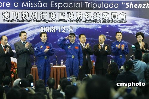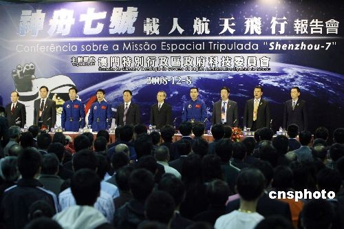 十二月八日,“神舟七號(hào)”載人航天飛行代表團(tuán)在澳門(mén)舉行報(bào)告會(huì)。代表團(tuán)團(tuán)長(zhǎng)、中國(guó)載人航天工程副總指揮張建啟、中國(guó)航天員翟志剛、劉伯明、景海鵬,以及載人航天工程有關(guān)系統(tǒng)的負(fù)責(zé)人等出席。中新社發(fā) 武仲林 攝