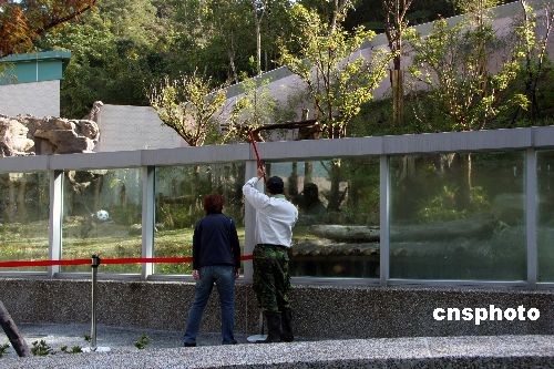 12月18日上午,臺北市動(dòng)物園進(jìn)行“游客參觀大貓熊動(dòng)線測試”演練,檢驗(yàn)動(dòng)物園方面目前所規(guī)劃的館內(nèi)教育展示解說、游客流量、流速及動(dòng)線順暢度。圖為工人在為“團(tuán)團(tuán)”、“圓圓”新家做護(hù)墻保潔。中新社發(fā) 劉舒凌 攝