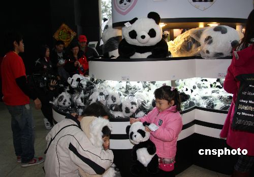 1月26日,大年初一。大陸贈(zèng)臺(tái)大熊貓團(tuán)團(tuán)圓圓正式與臺(tái)灣民眾見面,圖為團(tuán)團(tuán)圓圓居住的臺(tái)北市動(dòng)物園新光特展館熊貓商品展銷廳中,小朋友對(duì)絨毛熊貓玩偶愛不釋手。中新社發(fā) 陳立宇 攝