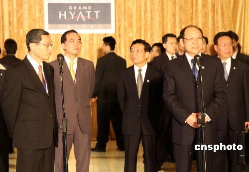 大陸海協(xié)會(huì)協(xié)商代表團(tuán)一行四月十七日下午抵達(dá)臺(tái)北。圖為代表團(tuán)入住君悅大飯店時(shí),臺(tái)灣;鶗(huì)副董事長高孔廉(左一)在大堂迎候。海協(xié)會(huì)常務(wù)副會(huì)長鄭立中(右二)、副會(huì)長李炳才(右三)、李亞飛(右一)與等候的媒體記者見面,鄭立中發(fā)表簡短談話。中新社發(fā) 耿軍 攝