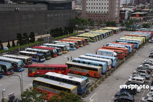 從今年三月起,到臺灣的大陸游客驟增,日抵人數(shù)甚至突破七千人。以大陸游客在臺灣停留六至十天計(jì),每天停留在臺灣的大陸游客有數(shù)萬人,以致游覽車不夠用。圖為在大陸游客參觀點(diǎn)臺北101大樓的附近停車場停滿旅游團(tuán)車輛。臺灣觀光局四月二十六日緊急研商決定,供大陸游客使用的游覽車車齡由七年放寬到十年,以增加一千三百六十輛游覽車緩解車輛不足。中新社發(fā) 耿軍 攝