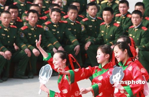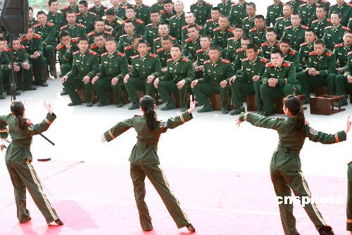 2月22日,武警江蘇總隊(duì)文工團(tuán)演員為蘇州武警官兵表演舞蹈。當(dāng)日,武警江蘇總隊(duì)政治部文工團(tuán)組織“慰問(wèn)抗雪救災(zāi)一線官兵及新戰(zhàn)友專場(chǎng)文藝巡演”之首場(chǎng)演出活動(dòng),在蘇州武警支隊(duì)新兵營(yíng)訓(xùn)練場(chǎng)熱鬧開(kāi)演。中新社發(fā) 蘇秀 攝
