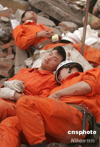 5月17日,在四川省什邡市鎣華鎮(zhèn)、紅白鎮(zhèn)等搶險(xiǎn)現(xiàn)場(chǎng),連續(xù)作戰(zhàn)的洛陽(yáng)消防搶險(xiǎn)救援突擊隊(duì)隊(duì)員們躺在瓦礫上小憩片刻。在四川地震災(zāi)區(qū),解放軍、武警、公安、邊防、消防官兵以及民兵、醫(yī)療救護(hù)人員和志愿者們,不怕危險(xiǎn),不畏疲勞,為搶救每一條寶貴的生命連續(xù)奮戰(zhàn)。中新社發(fā) 張曉理 攝