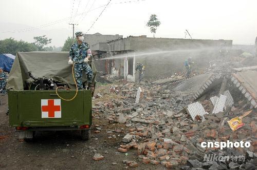 5月下旬,海軍衛(wèi)生防疫消殺突擊分隊(duì)的防疫車對(duì)四川地震災(zāi)區(qū)民房進(jìn)行預(yù)防性消毒。截至到5月30日上午,由86名專業(yè)隊(duì)員組成的衛(wèi)生防疫消殺突擊分隊(duì)已完成對(duì)四川綿竹、什邡等地震重災(zāi)區(qū)60多個(gè)市區(qū)街道、村莊的廢墟、房舍、疑似疫源地等場所進(jìn)行衛(wèi)生防疫和消毒殺菌,有效地控制了災(zāi)區(qū)的疫情隱患。中新社發(fā) 李唐 攝