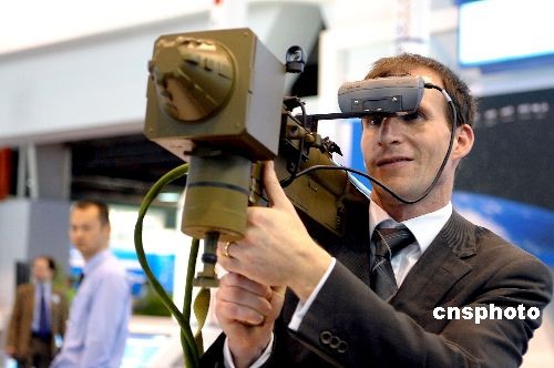 11月4日,第七屆中國國際航空航天博覽會在珠海開幕,二號館的中國防務(wù)展倍受中外關(guān)注,特別是遠(yuǎn)程制導(dǎo)多管火箭武器系統(tǒng)、地空導(dǎo)彈武器系統(tǒng)、地地導(dǎo)彈武器系統(tǒng)、車載防空導(dǎo)彈系統(tǒng)、神州七號飛船軌道艙、滑翔增程精確制導(dǎo)炸彈、運(yùn)載火箭、衛(wèi)星等。這是外國一專業(yè)人士對中國生產(chǎn)的射手訓(xùn)練模擬器頗感興趣。中新社發(fā) 陳文 攝