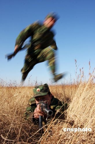 2008年12月25日,濟(jì)南軍區(qū)某部正在組織官兵進(jìn)行戰(zhàn)術(shù)訓(xùn)練。連日來(lái),該部把官兵拉到野外生疏地域,著力開展嚴(yán)寒條件下的冬季野營(yíng)訓(xùn)練,全面鍛煉部隊(duì)在嚴(yán)寒條件下的整體作戰(zhàn)能力。中新社發(fā) 梁志杰 攝