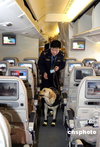 春節(jié)前夕,兩條名叫“維特”和“泰格”的拉布拉多緝毒犬出現(xiàn)在T3航站樓一架來自阿聯(lián)酋的飛機機艙內(nèi)。這是中國緝毒犬在歷史上首次登機檢查。近年來北京空港口岸人體藏毒和行李夾層藏毒案件明顯增多。為了進(jìn)一步增加緝毒手段的主動性,提高口岸查毒的準(zhǔn)確率,北京海關(guān)緝私局決定訓(xùn)練緝毒犬進(jìn)行登機檢查。海關(guān)緝毒人員對付跨國販毒分子又多了一個殺手锏。中新社發(fā) 雷虹 攝
