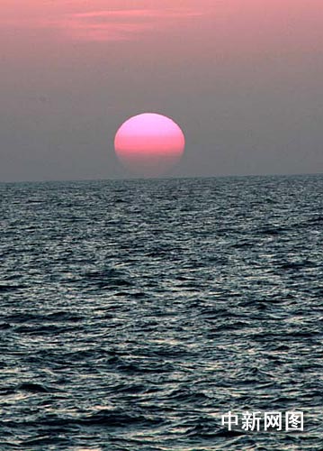 圖:亞丁灣海上日落時(shí)一輪紅日絢麗多彩