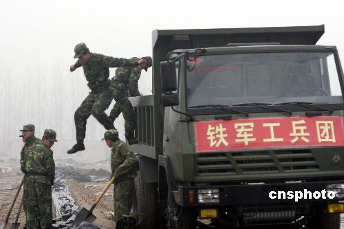 2月7日,鐵軍官兵在黃河岸邊進行導(dǎo)流渠開挖施工前的準(zhǔn)備工作。當(dāng)日濟南軍區(qū)鐵軍工兵團200多名官兵攜99臺工程裝備開進河南封丘黃河岸邊,開始搶挖抗旱導(dǎo)流渠。這條導(dǎo)流渠長約2300米,約需5天時間開挖完畢。黃河水經(jīng)此導(dǎo)流渠進入當(dāng)?shù)毓喔惹,將對黃河以北的河南新鄉(xiāng)市、安陽市等灌區(qū)的265萬畝進行灌溉,以解大旱之急。中新社發(fā) 張曉理 攝