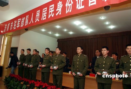 2009年2月26日,濟(jì)南警備區(qū)、濟(jì)南市公安局聯(lián)合舉行駐濟(jì)部隊(duì)現(xiàn)役軍人居民身份證首發(fā)儀式。自此,濟(jì)南市為駐濟(jì)部隊(duì)申領(lǐng)發(fā)放具名身份證工作正式啟動(dòng)。此舉將對(duì)部隊(duì)人員辦理儲(chǔ)蓄、保險(xiǎn)、買車、購(gòu)房等涉及個(gè)人權(quán)益事物時(shí)帶來(lái)便捷。中新社發(fā) 龔輝 攝