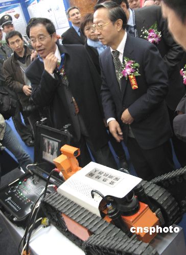 11月6日上午,“第十二屆中國國際煤炭采礦技術交流及設備展覽會”在北京全國農業(yè)展覽館開幕。開幕式上,中國國家安全監(jiān)督管理總局局長李毅中來到1號展廳,在中國研制的首臺“緊急搶險探測機器人”前,詢問有關技術指標。這臺由哈工大機器人研究所與唐山開誠公司共同研制的有線遙控機器人,可以在遇難、遇險礦井中行走500米距離,并可以爬坡、越障,到達指定地點,并探測井下有毒氣體、溫度、風速數據,對遇險礦工地段進行探測救險。中新社發(fā) 鄒憲 攝