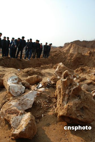 12月5日,山東淄博周村區(qū)王村鎮(zhèn)西道村磚廠挖掘出疑似“恐龍”的巨型動物骨骼化石。當(dāng)日10點(diǎn)48分,正在淄博周村區(qū)王村鎮(zhèn)西道村磚廠施工的司機(jī)小郝,給村主任劉道新打電話說“挖掘機(jī)在工作時(shí)挖到了大量的化石,很像是動物的骨骼。”在現(xiàn)場進(jìn)行保護(hù)的彭陽派出所的所長于成杰介紹說,這次挖到的化石很大,露出來的化石有6米多長,呈圓柱狀細(xì)端的直徑有18-19厘米,粗端的直徑有30-40厘米。其動物骨格的特征非常明顯,其體積顯然比大象要大的多,與史前動物“恐龍”骨骼化石極其相似。中新社發(fā) 梁寶海 攝