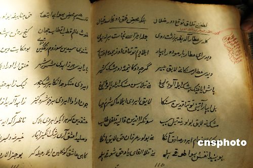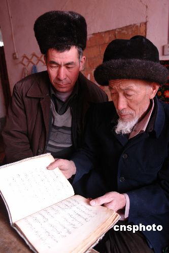 1月13日,吐魯番鄯善縣魯克沁鎮(zhèn)宗教人士在翻閱察合臺語長篇敘事詩《熱吾澤突孜左合熱》手稿。2006年新疆吐魯番地區(qū)少數民族古籍工作人員,在新疆鄯善縣魯克沁鎮(zhèn)兩位宗教人士手中,先后發(fā)現古西域著名維吾爾族詩人艾合買提·吾加木尼牙孜在1802年,用察合臺語(古維吾爾語)創(chuàng)作的長篇敘事詩《熱吾澤突孜左合熱》(漢譯:左合熱的文明園)手稿,和清代西域維吾爾族學者吾布勒·伊斯拉木,從波斯語翻譯為察合臺語(古維吾爾語)的抄本《麥魯麻提阿帕克》(漢譯:世界通訊)。這兩本古籍對研究古西域文學、歷史、地理和古絲綢之路文明具有重要意義。目前,這兩本古籍已經列入國家珍貴古籍名錄。中新社發(fā) 姜浩 攝