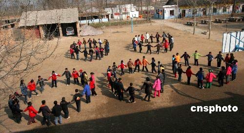 2月22日,啟航學(xué)校的留守學(xué)生手拉手組成奧運(yùn)“五環(huán)”標(biāo)志圖案。當(dāng)日,陜西興平市趙村鎮(zhèn)啟航學(xué)校2008年春季開(kāi)學(xué),該校240多名留守學(xué)生入學(xué)報(bào)到,老師領(lǐng)著學(xué)生們?cè)诓賵?chǎng)上手拉手組成了奧運(yùn)“五環(huán)”標(biāo)志圖案,表達(dá)留守孩子們對(duì)2008年北京奧運(yùn)會(huì)的期盼和祝福。中新社發(fā) 何建虎 攝