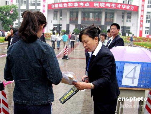 6月7日,監(jiān)考人員在用沈陽市給考場配備的手柄式金屬探測器進行安檢。當天是全國高考第一天,遼寧省共有298404名考生報名參加考試,全省14個市共設考區(qū)101個,考點326個,考場10446個。中新社發(fā) 趙敬東 攝