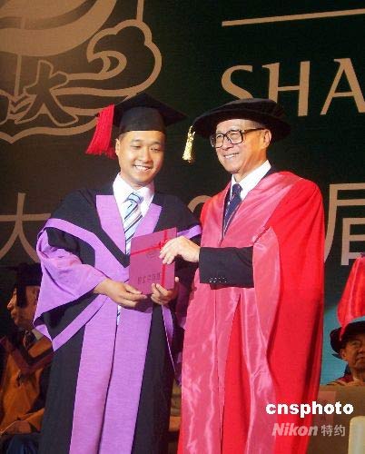 六月二十六日,廣東汕頭大學(xué)舉行二00八屆畢業(yè)典禮。圖為校董會名譽(yù)主席李嘉誠為該校博士生頒發(fā)學(xué)位證書。中新社發(fā) 李怡青 攝