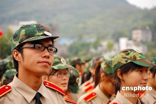 2008年9月3日,重慶西南大學(xué)育才學(xué)院3000多名新生走進(jìn)軍營開始軍事訓(xùn)練。作為第一批90后的大學(xué)生,他們進(jìn)入大學(xué)后的第一堂課是體驗(yàn)軍旅生活,鍛煉堅(jiān)強(qiáng)意志。中新社發(fā) 許康平 攝