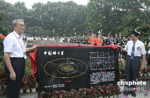 9月20日,在中國科技大學(xué)東區(qū)郭沫若廣場上隆重舉行科大五十年校慶日升旗暨“中國科大星”紀(jì)念碑揭幕儀式,為學(xué)校五十華誕獻(xiàn)上第一份祝福。2007年元月,國家天文臺(tái)研究決定,選定編號(hào)為19298這顆于1996年9月20日即科大校慶日發(fā)現(xiàn)的小行星命名為“中國科大星”。之前,內(nèi)地以高等學(xué)校名稱命名的小行星只有4顆,分別是“北京大學(xué)星”、“南京大學(xué)星”、“北京師范大學(xué)星”和“山東大學(xué)星”。圖為中科院黨組成員、校黨委書記郭傳杰(左)和龔惠興院士(右)共同為“中國科大星”紀(jì)念碑揭幕。中新社發(fā) 張婭子 攝