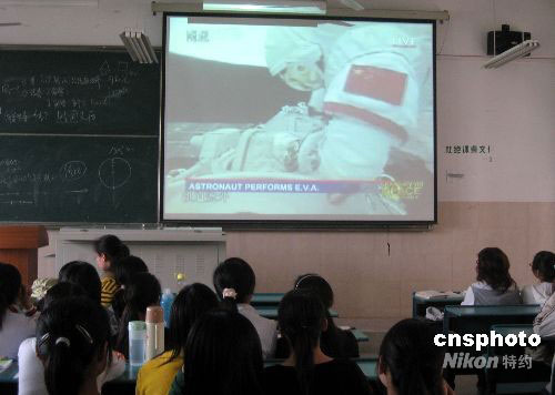 2008年9月27日下午,安徽師范大學學生在教室集體觀看宇航員太空行走直播。北京時間9月27日下午四點五十九分,神舟七號航天員翟志剛成功出艙,實現中國歷史上第一次太空行走。中新社發(fā) 劉淮宇 攝
