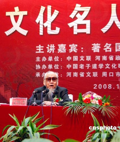 10月21日,著名國學大師文懷沙在名人講壇上縱論老子,博得全場陣陣掌聲。10月20日晚,“2008中國鹿邑國際老子文化節(jié)”在老子故里河南省鹿邑縣召開,98歲高齡的著名國學大師文懷沙出席了開幕式。據悉,本屆文化節(jié)由中國文聯、政協河南省委員會、中國國際文化傳播中心主辦,為期兩天,以“建設民族精神家園——尊道·貴德·和諧·發(fā)展”為主題,包括老子文化高層論壇、國學大師文懷沙報告會、經貿合作與簽約儀式等活動。 鹿邑縣位于河南省東部,是道家學派創(chuàng)始人老子的故里,被稱為“道家之源,道教祖庭,李姓之根”。中新社發(fā) 蔣保慶 攝