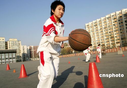 11月21日,北京中學(xué)生在體育課上積極練習(xí)籃球運(yùn)球往返跑,應(yīng)對(duì)中考體育考試科目變化。近日,2009年中考體育方案出臺(tái),明年中考體育總分仍為30分,并將首次實(shí)現(xiàn)全市統(tǒng)一考試項(xiàng)目、統(tǒng)一成績(jī)?cè)u(píng)定標(biāo)準(zhǔn)、統(tǒng)一考試規(guī)程和統(tǒng)一考試時(shí)間的“四統(tǒng)一”。在考試項(xiàng)目上,男女生都必考的立定跳遠(yuǎn)將就此退出中考,取而代之的是繞標(biāo)志物15米往返籃球運(yùn)球。中新社發(fā) 富田 攝