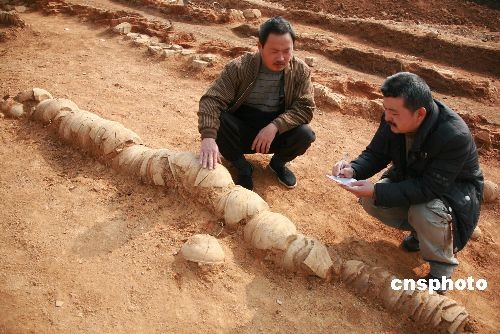 2008年12月20日,歙縣北宋龍窯遺址發(fā)掘現(xiàn)場(chǎng)。近日,安徽歙縣桂林鎮(zhèn)發(fā)現(xiàn)一處北宋龍窯遺址,面積達(dá)3700多平方米,出土了大量精美青瓷珍貴文物。經(jīng)安徽省考古專家勘察鑒定為北宋時(shí)的龍窯,主要生產(chǎn)陶器和青瓷,專家分析至少有上千件珍稀文物。該處北宋龍窯遺址于2008年9月開(kāi)挖績(jī)黃高速公路3標(biāo)段連接線時(shí)發(fā)現(xiàn)。中新社發(fā) 方也廣德 攝