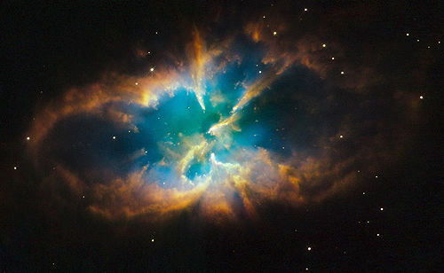 據(jù)美國每日太空網(wǎng)報道,哈勃太空望遠(yuǎn)鏡日前拍攝到銀河系內(nèi)一個罕見的美麗行星狀星云NGC2818,它隱藏在一個距離地球1萬光年羅盤星座的恒星團(tuán)內(nèi)部。這張精美的圖片是由哈勃太空望遠(yuǎn)鏡廣角行星2號相機(jī)于2008年11月份拍攝的,其彩色部分分別代表著該星云的噴射釋放物質(zhì),它們共同組成細(xì)絲狀漩渦結(jié)構(gòu),其中紅色部分代表氮?dú)、綠色部分代表氫氣、藍(lán)色部分代表氧氣。