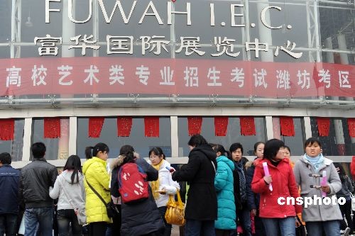 2009年2月4日,在山東濰坊富華國(guó)際展覽中心“藝考濰坊報(bào)名點(diǎn)”,參加2009年省外院校藝術(shù)專業(yè)考試的考生正在排隊(duì)報(bào)名。2009年藝考將于2月5日正式開(kāi)考,歷時(shí)半個(gè)月。據(jù)了解,今年藝考山東省共報(bào)名96000人左右,濰坊市報(bào)名11000余人。中新社發(fā) 王志德 攝