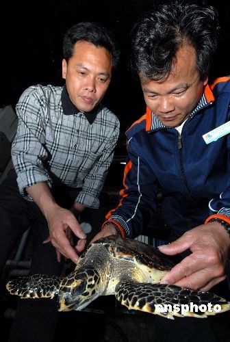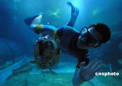 4月13日,福州一漁民將其幾天前在海邊偶然發(fā)現(xiàn)的“玳瑁”海龜送進(jìn)福州左海海底世界。這只“玳!遍L約12厘米,重約1750克,嘴如鷹嘴,甲殼為褐色,頜緣鋸齒狀。據(jù)飼養(yǎng)員介紹,這只小海龜大約才2歲,還屬于“嬰兒”狀態(tài)!扮殍!庇址Q十三鱗,屬于國家二級保護(hù)動物,一般壽命可達(dá)1500歲,成年的玳瑁(約20多歲)身長1米,體重40~60公斤,主要生長于熱帶及亞熱帶地區(qū)的暖水性海洋。該類海龜在中國主要分布于臺灣、福建和海南等沿海一帶海域。 中新社發(fā) 穆長梓 攝