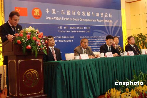 十月三十日,由中國(guó)國(guó)務(wù)院扶貧辦和廣西壯族自治區(qū)人民政府共同舉辦的中國(guó)-東盟社會(huì)發(fā)展與減貧論壇在廣西南寧正式開(kāi)幕。中國(guó)和東盟十國(guó)主管扶貧工作的高級(jí)官員、社會(huì)發(fā)展和減貧領(lǐng)域的專家學(xué)者及企業(yè)家等一百余人就“推進(jìn)區(qū)域社會(huì)發(fā)展與減貧交流合作”主題進(jìn)行研討。中新社發(fā) 黃艷梅 攝