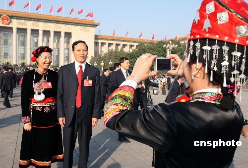 中國共產(chǎn)黨第十七次全國代表大會10月21日上午在北京人民大會堂閉幕。圖為福建代表團(tuán)的畬族代表雷金花在大會堂外為代表們拍攝紀(jì)念照。中新社發(fā) 任晨鳴 攝