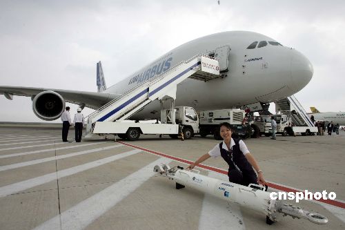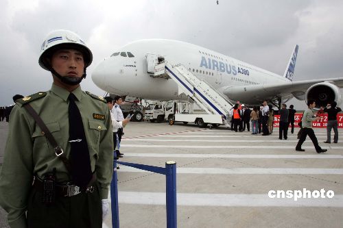 十月二十五日,空中客車A380飛機在上海浦東國際機場展示,據(jù)悉,這架生產(chǎn)序列號為007的A380是首度在上海公開其豪華客艙內(nèi)飾?湛凸ぷ魅藛T在此間表示,A380目前獲得十六家客戶的一百八十九架確認及承諾訂單,○八年將交付十三架,○九年交付二十五架,到二○一○年,將年產(chǎn)四十架,而中國南方航空訂購的五架A380計劃在○九年下半年交付。中新社發(fā) 潘索菲 攝