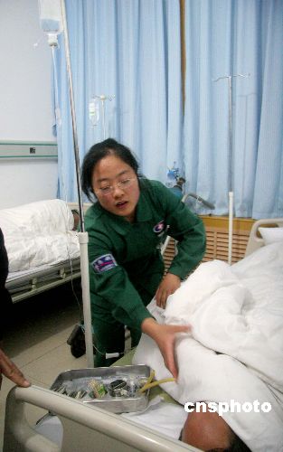 醫(yī)護人員在為獲救的船員檢查體溫。