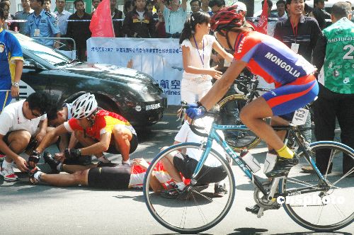 2007年11月6日,“海馬汽車杯”環(huán)海南島國(guó)際公路自行車賽進(jìn)入第三賽段文昌——?诒荣。各國(guó)選手在歷經(jīng)總里程125公里后,快速?zèng)_刺設(shè)在?谑袨I海大道的終點(diǎn)站時(shí),一名在劃線內(nèi)的記者突然探頭出來(lái)?yè)屌恼掌,結(jié)果被撞頭破血流,相機(jī)摔破,而兩名選手人仰馬翻摔成重傷,另一選手被擦輕傷,當(dāng)時(shí)的驚險(xiǎn)場(chǎng)面引起觀賽者一片驚呼聲。中新社發(fā) 善平 攝