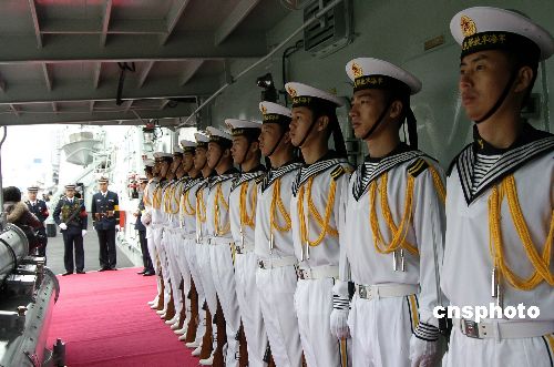 11月29日,中國(guó)“深圳”號(hào)導(dǎo)彈驅(qū)逐艦對(duì)日本的友好訪問進(jìn)入第二天,雙方進(jìn)行了高層拜訪、參觀軍艦、體育比賽等各種交流。圖為等待日本海上自衛(wèi)隊(duì)參謀長(zhǎng)吉川榮治檢閱的“深圳”號(hào)艦上儀仗隊(duì)。中新社發(fā) 朱沿華 攝