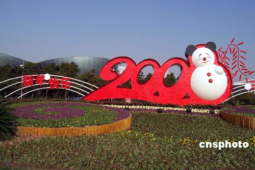 12月31日。上海浦東世紀(jì)廣場的上萬盆鮮花和大型“2008”賀年牌及其中那白色的“8”字“雪鼠”別致造型,迎接2008年到來。中新社發(fā) 周東潮 攝