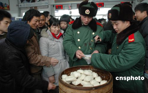 1月31日中午,武警浙江省臺(tái)州市消防支隊(duì)?wèi)?zhàn)士孫嘉飛和曹敏抬著200余只熱饅頭,來到臺(tái)州市客運(yùn)總站,送給因雨雪天氣滯留在車站的旅客。連日來,消防戰(zhàn)士們送免費(fèi)餐的忙碌身影活躍在臺(tái)州各縣市車站。中新社發(fā) 朱叢義 攝