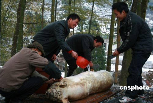 2月4日是農歷的“立春”節(jié)氣,被冰雪封凍20多天的廣西融水縣滾貝鄉(xiāng)災民殺豬喜迎新春。由于得到當?shù)卣募皶r救助,面對遭受57年來最嚴重的雨雪冰凍災害,災民們對未來依然充滿信心。中新社發(fā) 張耀華 攝