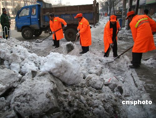 2008年2月7日,大年初一,安徽蒙城縣環(huán)衛(wèi)工人放棄休息,對市區(qū)主要道路人行道上的積雪進(jìn)行清理,以辛苦勞動(dòng)為歡度春節(jié)的市民營造良好的出行環(huán)境。中新社發(fā) 胡衛(wèi)國 攝
