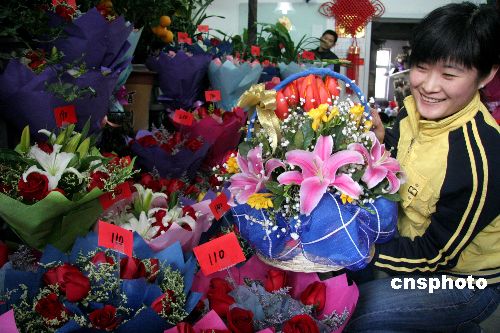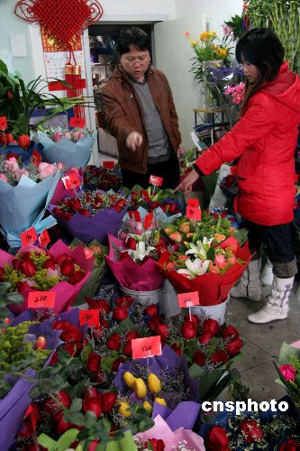 2月13日,顧客在挑選鮮花。為迎接“情人節(jié)”,山東威海各花店生意紅火,許多顧客為女友和母親訂購鮮花,鮮花市場銷售異;鸨,許多花店為此招臨時工幫忙。中新社發(fā) 海云飛 攝