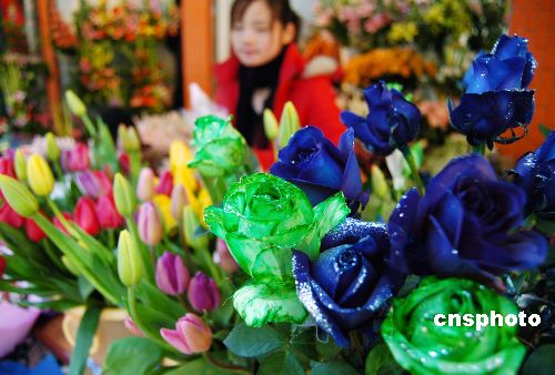二月十三日,西方情人節(jié)將至,僑鄉(xiāng)泉州城大大小小花店迎來銷售高潮,由昆明引進的五彩玫瑰尤其受到僑鄉(xiāng)青年的青睞。中新社發(fā) 傅丹丹 攝