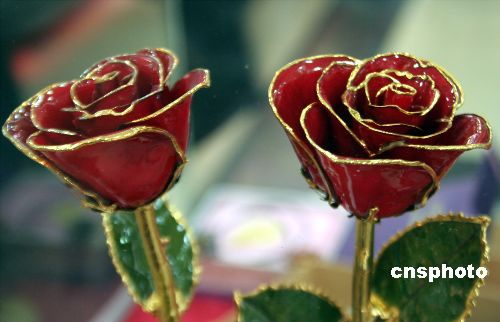 2008年2月13日,“情人節(jié)”前夕,遼寧省沈陽市中街一商廈售價(jià)521元的金玫瑰花面市。中新社發(fā) 劉寶成 攝