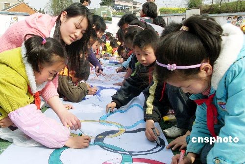 4月2日,江蘇大學(xué)人文學(xué)院50多名大學(xué)生走進(jìn)鎮(zhèn)江市七里甸中心小學(xué),與該校學(xué)生一起開(kāi)展“大小學(xué)子共繪奧運(yùn)畫卷”活動(dòng),學(xué)子們?cè)诎倜组L(zhǎng)卷上共同繪制了奧運(yùn)福娃、五環(huán)標(biāo)志和各類運(yùn)動(dòng)項(xiàng)目等圖案,表達(dá)他們對(duì)北京奧運(yùn)會(huì)的期盼和祝愿。作者: 石玉成