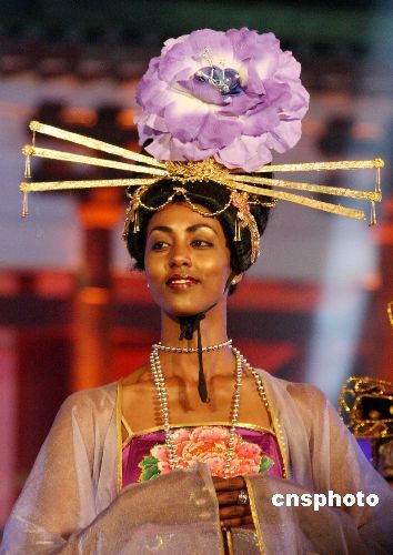 4月1日晚,2008國際旅游小姐總決賽“迪斯科皇后”單項決賽晚會在河南洛陽舉行。來自世界115個國家的115位佳麗參賽,在晚會現(xiàn)場4位不同膚色的佳麗當(dāng)場“秀”起了中國傳統(tǒng)服飾--唐裝。中新社發(fā) 曾憲平 攝