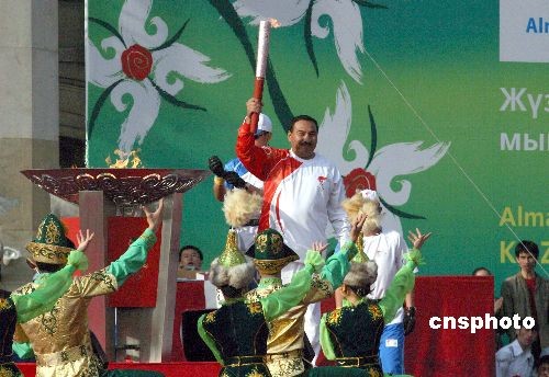 2000年奧運(yùn)會(huì)拳擊冠軍葉爾馬罕·伊布拉莫夫用手中的火炬點(diǎn)燃圣火盤(pán)后,展示手中的火炬。沈晨攝