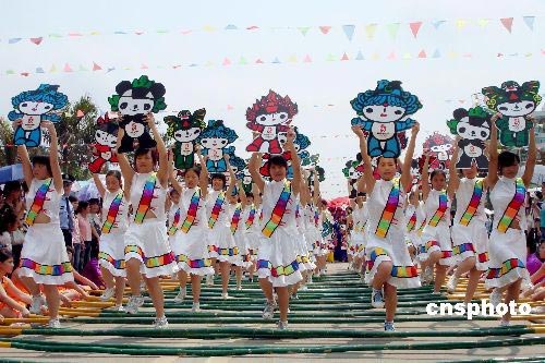 4月8日是中國最大的少數(shù)民族——壯族富有民族特色的傳統(tǒng)節(jié)日“三月三”歌圩!爸袊鴫燕l(xiāng)”廣西武鳴縣2008名壯族男女身著各色鮮艷的民族服裝,排著整齊的表演方陣,在近千米長的竹杠陣內,跳起民族傳統(tǒng)的竹杠舞歡慶節(jié)日,喜迎奧運會。中新社發(fā) 黃艷梅 攝